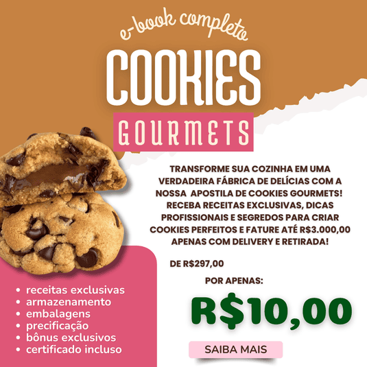 Receba receitas exclusivas, dicas profissionais e segredos para criar cookies perfeitos, desde o clássico cookie de chocolate até criações gourmets! Fácil de seguir, ideal para iniciantes e experientes, você aprenderá a fazer cookies que farão você faturar mais de R$3.000,00 POR MÊS, apenas com delivery e retirada!