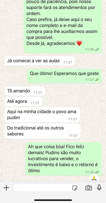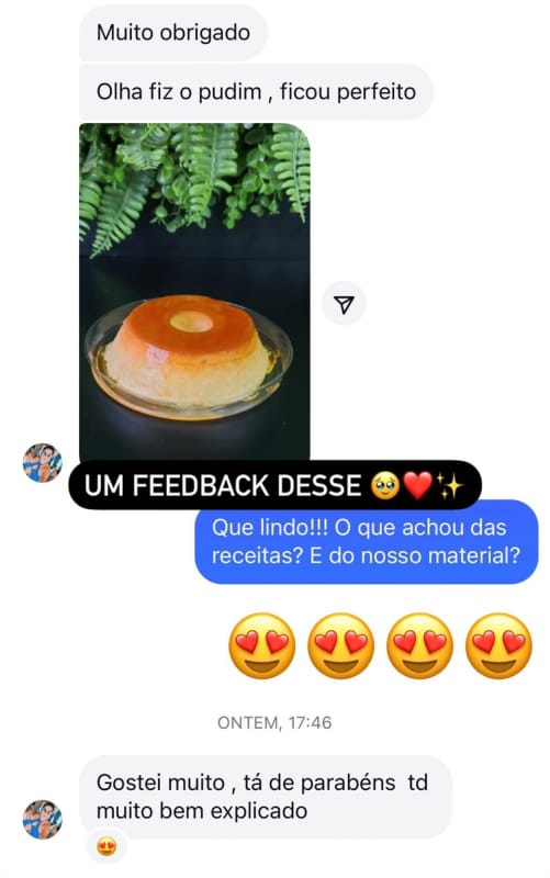Em nossa apostila com mais de 100 páginas, você terá acesso à receitas bônus exclusivas, que farão você triplicar o seu faturamento e vender todos os dias! Diversas receitas de pudins saborizados, e mini pudins exclusivos.